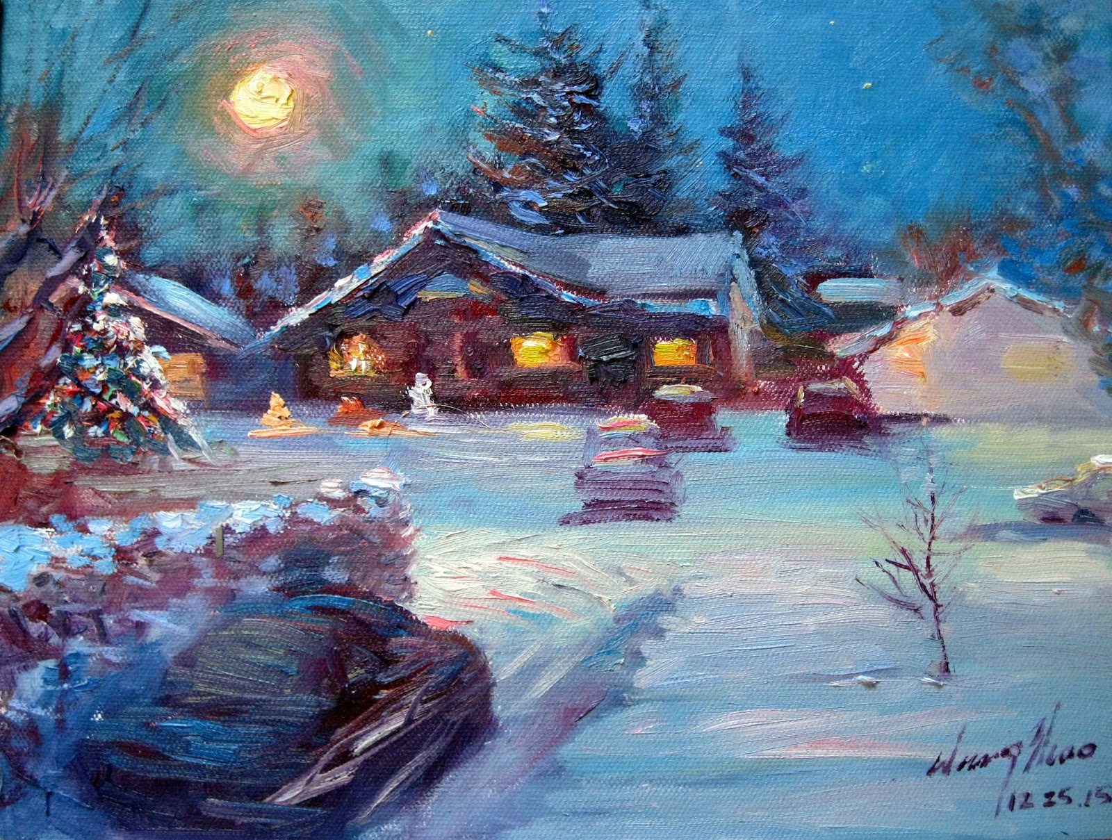 Christmas Morning at 8 a.m this morning when the street light remained and Christmas lights were still on from Balmoral Bay Brandon. Painted this quick oil sketch at the crack of dawn this morning while listening to the live performance of Hendel's Messiah on CBC Radio 2. Some distant memory flashed back to me from the Christmas Eve of 1989, 26 years ago. I remember it must be on a Sunday. I was teaching high school in China back then, and as a rule I had to go to class to teach that day as well. Facing reluctant class of over 50 students, instead of a normal routine class, I played to them from an old cassette recorder Hendel's Messiah telling them some stories from Bible using a copy of Bible Stories for Children published in Australia as a reference, the book which I had just translated into Chinese language then.The students so enjoyed it for never ever beofre had they heard anything like that. However, When the school principle who was also the Party secretary found out later, I received a server warning as a result. Maybe it just further firmed my will to leave China even at the price of leaving my young family behind. The urge of leaving was so strong , I remember, that I even wish to be able to spend the rest of my life in a snow-covered land where you could have a real white Christmas. That year, I started my two year long process of trying to get my passport, writing my Test of English as Foreign Language test , sending my applications to Canadian universities from coast to coast, and approaching Canadian Embassy in Beijing for my entry visa. I remember after my last visit to Canadian Embassy in Beijing at the end of March in 1991, I bid my farewell to my Praying Grandmother in her late 80s wheelchair bound who resided in Beijing with my Aunt then. . As I stepped outdoor on that unforgeable morning, it started to snow , and it snowed non-stop so heavily that the whole northern China seemed to be completely covered with snow as I was travelling down south by train. I remember vividly on that train how two passengers got into fist flight over the dispute of a seat, and how the rest of passengers cheered on. I felt so disgusted by the sight. I just started to pray that please God takes me out of this miserable place and take me to Canada so that I will have my first white Christmas. At that very moment, I just could not believe my ears, of all the places, right there and right at that particular moment, there came on the air via the speaker system of the passenger train, a children's choir of Silent Night and Holy Night! I remember tear streamed down my face , and I started to write to my grandmother a letter sharing the experience with her. When she received the later a week later, she wrote to me telling me that it was a sign that I would leave very soon for that far faraway land. A month later I received my visa from Canadian Embassy, and on Christmas Eve of 1991 I was found on board of Grey Hound Bus heading for Three Hills Prairie Bible Institute to attend Chinese Christian Winter Camp hosted by that college!